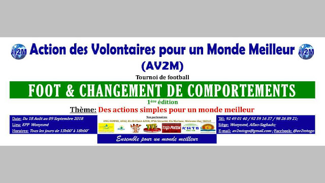 L’association “Action des Volontaires pour un Monde Meilleur”, (AV2M) qui intervient dans le domaine de la santé, de l’environnement, de l’éducation, du tourisme et du sport organise du 18 Août au 9 Septembre 2018 pour le compte des grandes vacances un tournoi de football de petits poteaux dénommé “Foot et Changement de Comportement”.