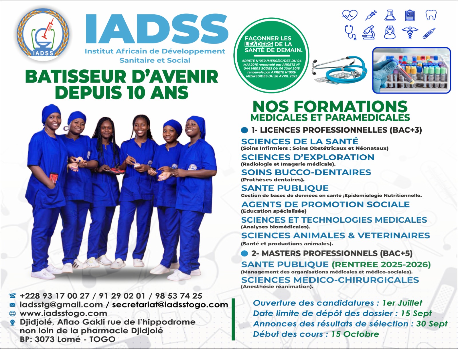 Les préparatifs vont bon train pour le début de la rentrée 2025-2026 à l’Institut Africain de Développement Sanitaire et Social (IADSS) au Togo. Le dépôt des dossiers de candidatures ouvert depuis mardi 1er juillet 2025, se poursuit jusqu’à lundi 15 septembre 2025 avec l’annonce des résultats de sélection mardi 30 septembre 2025.