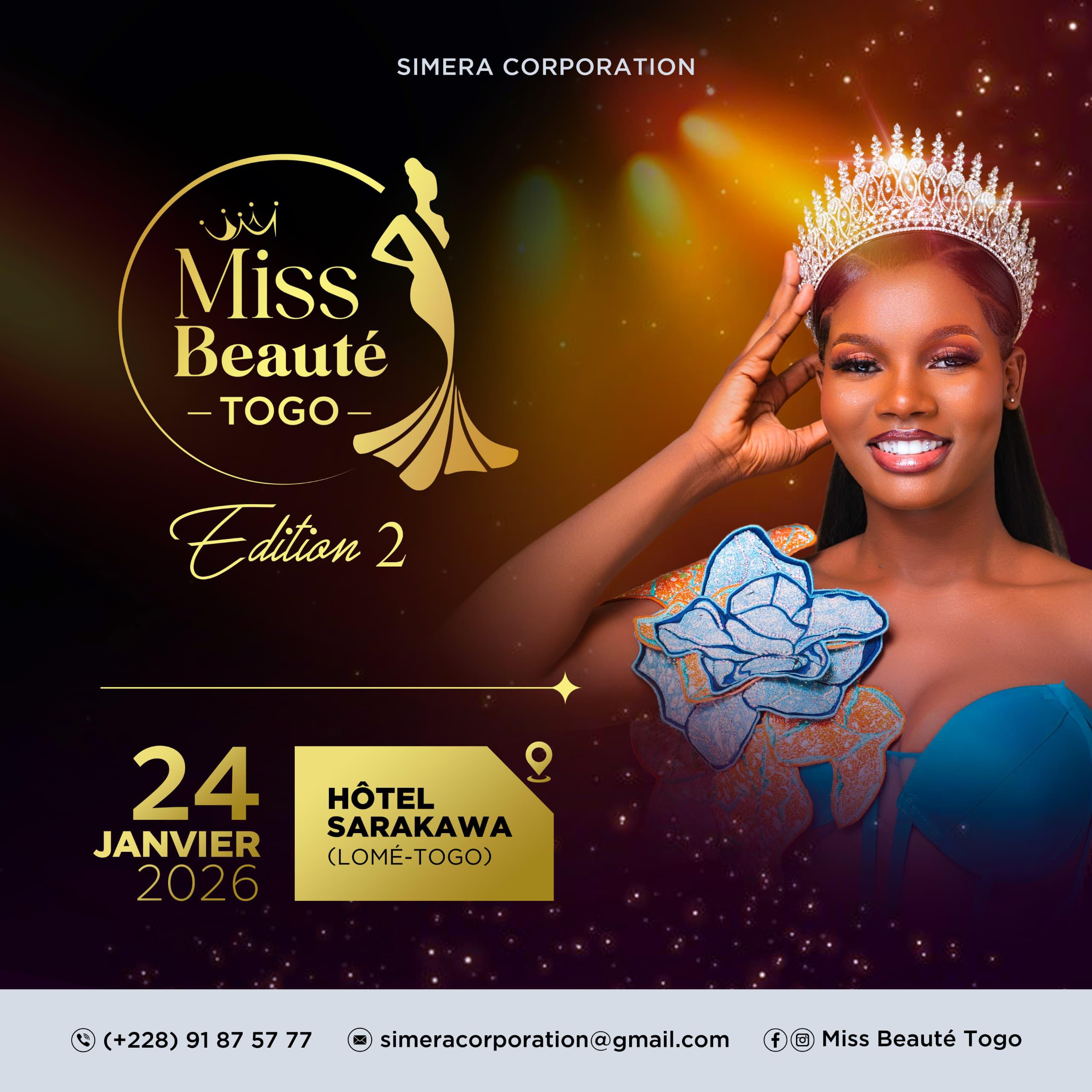 La 2ème édition de Miss Beauté Togo s’annonce le samedi 24 janvier 2026, à l’hôtel Sarakawa à Lomé. Ce concours de beauté organisé par Simera Corporation promeut le leadership féminin au Togo.