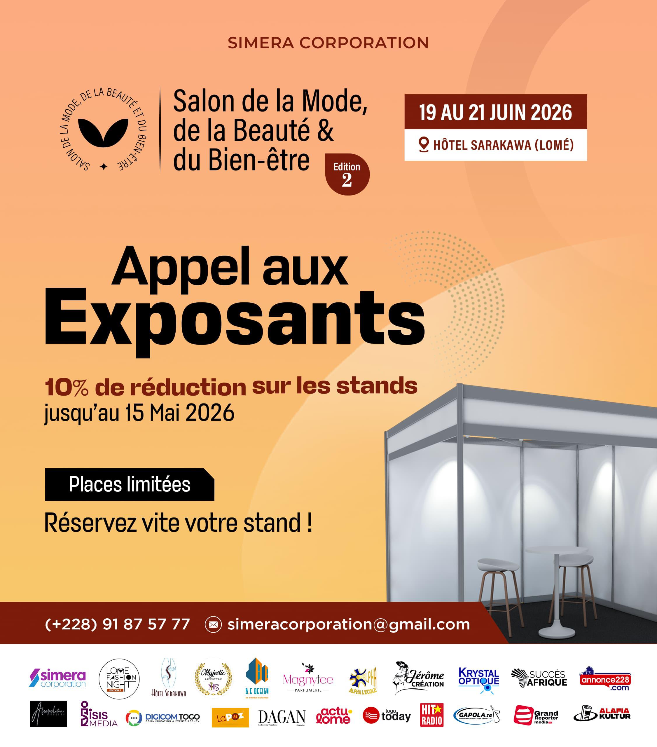 À travers cet événement d’envergure, Simera Corporation lance un appel fort aux exposants issus de divers horizons. Stylistes, marques de vêtements, accessoiristes, professionnels de la cosmétique, salons de coiffure, maquilleurs, parfumeries, bijouteries et experts du bien-être sont invités à rejoindre cette plateforme unique de visibilité et de développement.